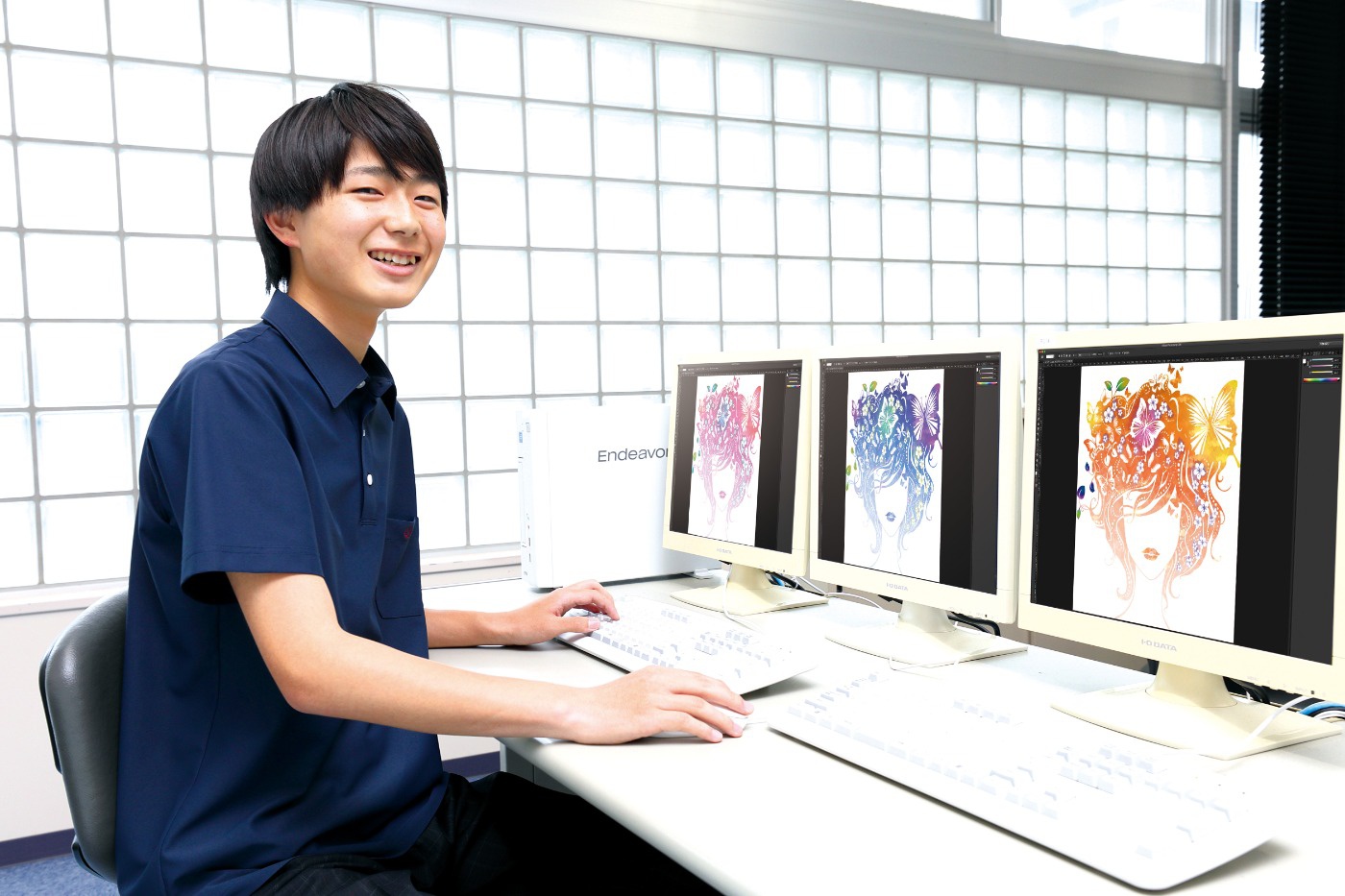 商業科で学習する簿記やビジネスマナーはもちろんのこと情報処理についても学習します。文字情報では伝えきれない情報を、色や形というデザインで表現し、誰かの生活を豊かにする。この専攻ではデザインについても学ぶことができます。絵で色々な物を表現するためには、日頃から物事をよく観察し、普段は気づかない細部まで気づく洞察力が必要です。デッサンの基礎を学び、洞察力や客観的にものをとらえる力を身に付け、表現力を養います。グラフィックソフト(Photoshop)を使うことでデザイナーとしてのスキルやデザイン力を身に付けます。