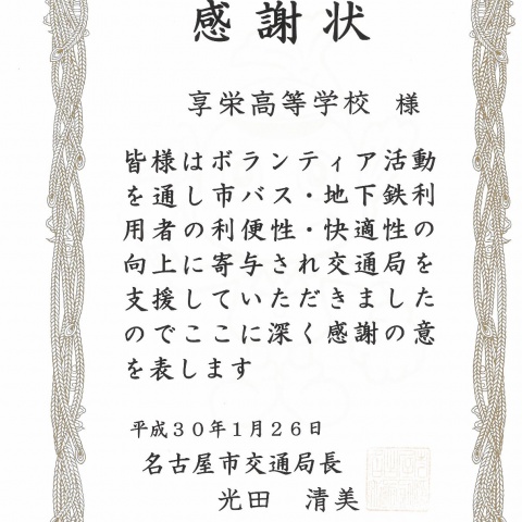 地下鉄桜山駅における清掃活動に対して、名古屋市交通局より「ボランテ...