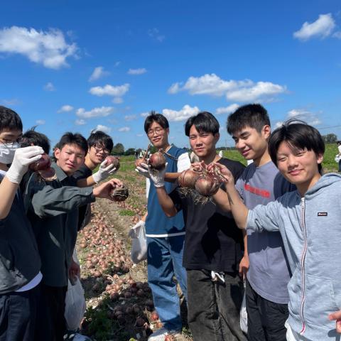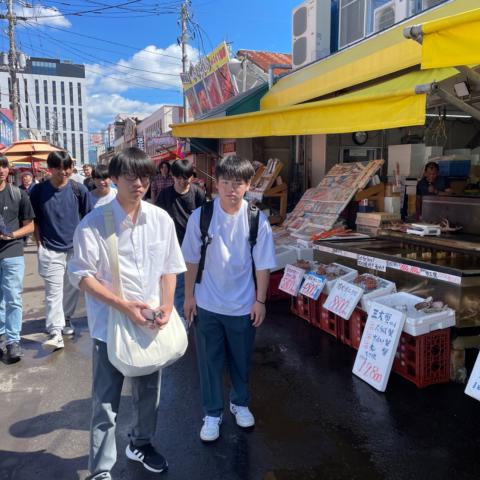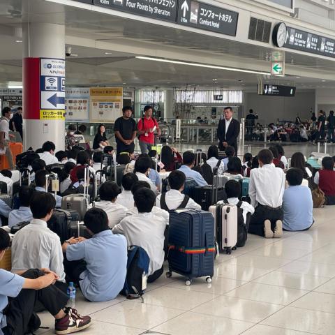 手前から 墨選手(日本体育大学)、福田選手(駒澤大学)、近藤選手(中央大学)、佐藤選手(駒澤大学)、山内君(現役生徒)、後ろに、服部選手(東洋大学)