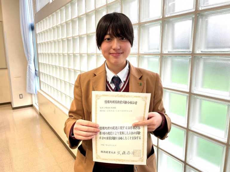 基本情報技術者試験に合格することを高校生活での1つの目標にしていたので、とても嬉しいです。無事合格することができたのは先生方の丁寧な授業と、周囲の方々の励ましのおかげだと思っています。次は応用情報技術者試験に合格するべく勉強を重ねていきます。