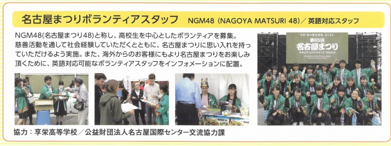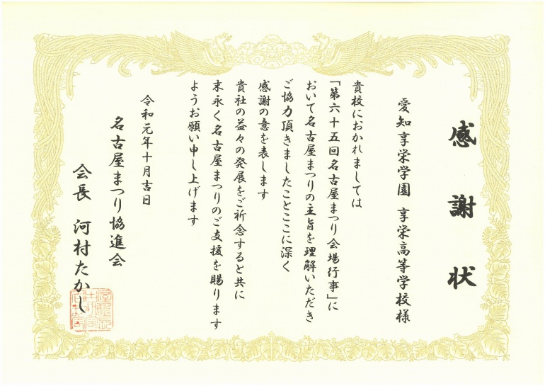 毎年10月に久屋大通公園で行われる名古屋まつりの高校生ボランティアに本校生徒会役員、部活動生徒が参加をしています。名古屋まつりが一層盛り上がることを願い、高校生の手でそのお手伝いをしたいという思いで毎年参加させて頂いております。今年度は令和元年10月19日、20日に行われました。名古屋まつり協進会会長である名古屋市長、河村たかし様より感謝状を頂き、事後報告書2ページに本校生徒の活動の様子を掲載して頂きました。