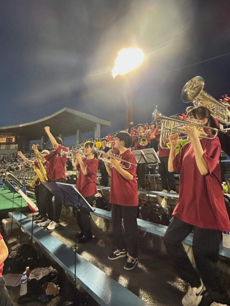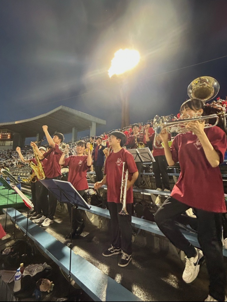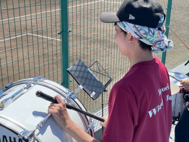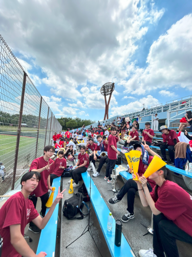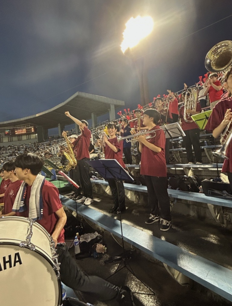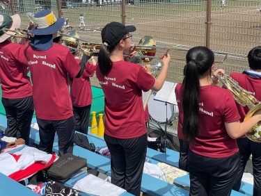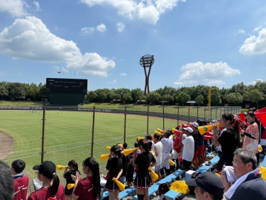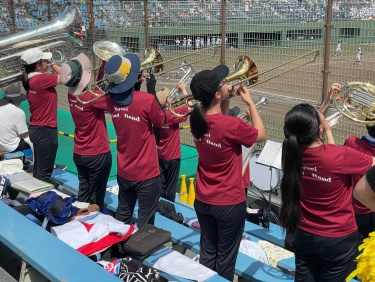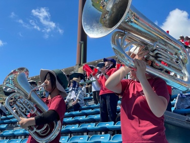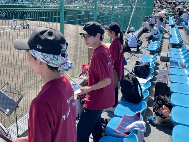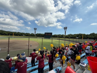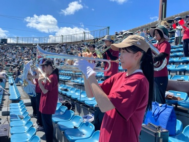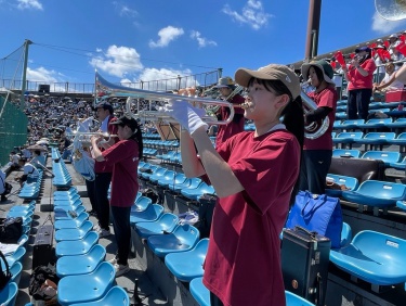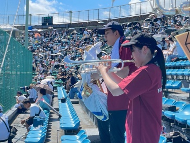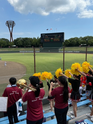 7/18(金),20(日)チアリーディング部、運動部と一緒に岡崎レッドダイヤモンドスタジアムへ硬式野球部の応援に行ってきました。 暑い中での演奏でしたが野球部の全力の姿に刺激を受け、演奏にも自然と熱が入りました。 演奏で試合を盛り上げることができ、とても楽しかったです。 (写真は7/18の応援の様子です。)