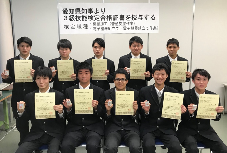卒業を前に、機械科の上級資格取得者を集めて記念撮影をしました。合格証書を持つ生徒の表情は誇りと喜びに満ち、資格を取得するまでの弛まぬ努力が報われた瞬間でもありました。卒業後の進路先においても、常に向上心を持って事に当たる姿勢を忘れないことを決意し、本校を巣立っていきました。