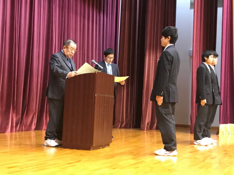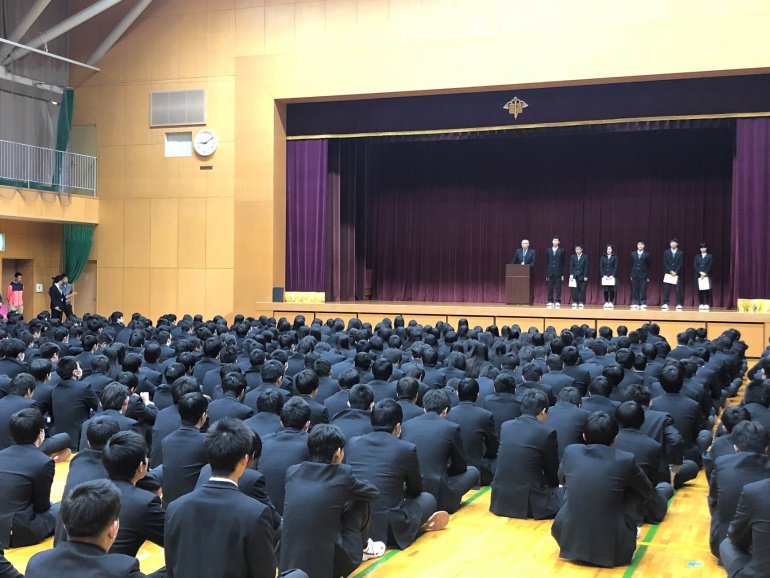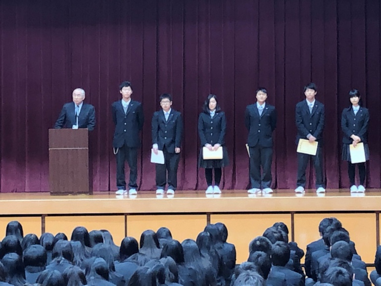 2学期終業式後の生徒会主催の表彰式において、「愛知県工業高校生溶接競技大会」と「技能検定」の伝達表彰が行われ、日頃の実技練習の成果が多くの生徒の前で披露されました。