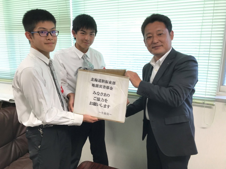 2018年10月30日(火) 学校行事 学校ニュース 「北海道胆振東部地震災害募金」の寄付について 10月30日(火)、北海道胆振東部地震災害に関する募金を瑞穂区社会福祉協議会へ寄付させて頂きました。過日、本校で実施した募金活動と9月に行われた文化祭の模擬店収益の一部を合わせて、¥281,663となりました。写真は事務局長の田端敬則様へ生徒会執行部よりお渡しした様子です。1日も早い復興を願いつつ、本校では今後もこのような募金活動を継続していきます。