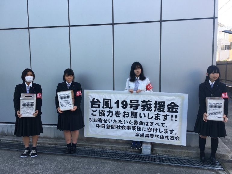 2019年10月31日(木) 学校行事 学校ニュース 「台風19号募金活動」を実施しました 10月30日(水)、31日(木)の2日間、本校にて台風19号被害に関する募金活動を実施しました。台風19号で被害に遭われた地域の復旧が思うように進んでいない中、少しでも被災した方々の支えになることは出来ないかと生徒会役員生徒の呼びかけで実施しました。多くの生徒が「私たちに何ができるのか」を真剣に考え、募金活動に参加してくれました。今後、この募金は関係機関を通じて被災地へ届けたいと思います。