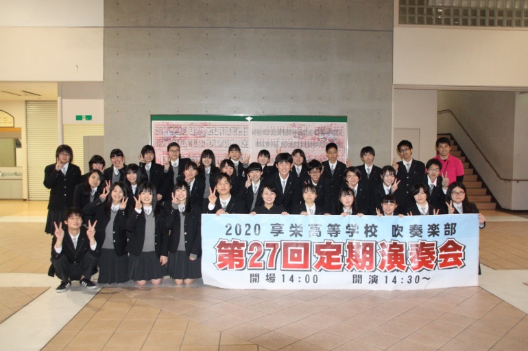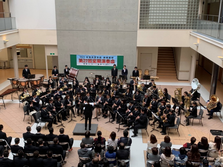 2020年02月18日(火) 部活動 学校ニュース 吹奏楽部 第27回定期演奏会 開催 2月15日の土曜日に吹奏楽部が第27回定期演奏会を本校アトリウムにて開催しました。 約200名のお客様に来てもらい、3年生は最後の演奏を飾ることが出来ました。 3部構成 1部:マーチングステージ 2部:吹奏楽オリジナルステージ 3部:ポップスステージ これからも応援よろしくお願いいたします。 マーチングステージの様子 吹奏楽オリジナルステージの様子