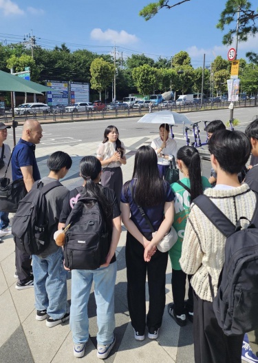 事前研修にて南北の国際情勢について学んできました。道中、現地ガイドのリーさんから説明を受けながら展望台に到着。あいにくの雨模様で視界が悪かったですが、真剣に学んでいました。