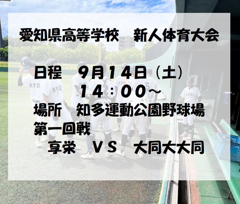 2024年09月16日(月) 部活動 学校ニュース 軟式野球部 愛知県新人体育大会の結果について 9月14日(土)に知多市営球場で行われた新人戦県大会結果ですが、享栄VS大同は0-3で惜しくも敗戦してしまいました。 春は東海大会に出場できるよう一から鍛え直します。 詳細:9月14日(土)は第3試合だった為、球場の使用時間の関係上、7回で終了し、9月16日(月)に継続試合という形で8回から再開しました。