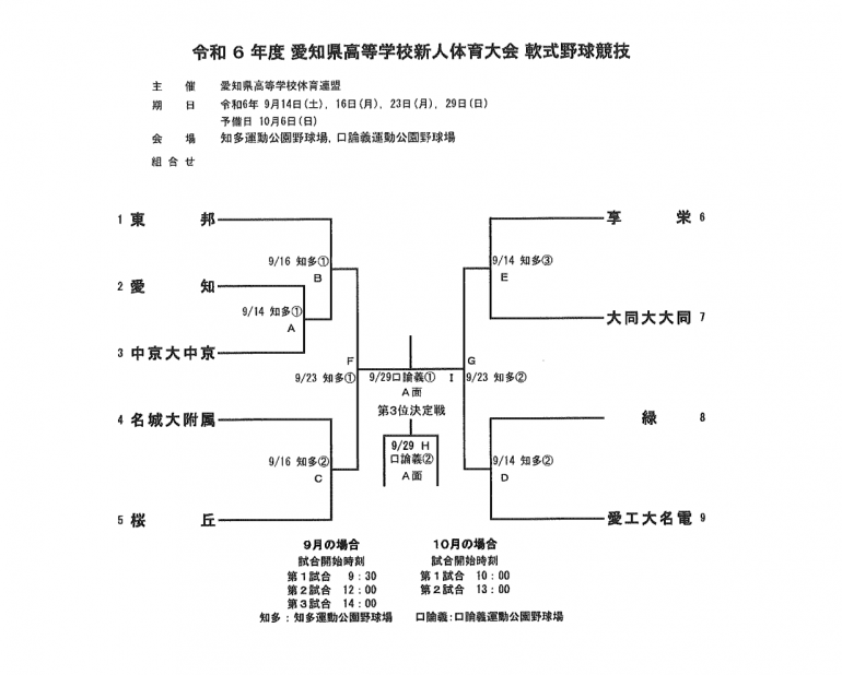 2024年10月25日(金) 部活動 学校ニュース 軟式野球部 秋季愛知県高等学校 愛知県大会のお知らせ 10月27日(日)から秋季愛知県高等学校 愛知県大会 軟式野球競技がはじまります。 1回戦:愛知高校 日 程:10月27日(日)13時25分~ 場 所:熱田愛知時計120スタジアム となります。応援よろしくお願いします。