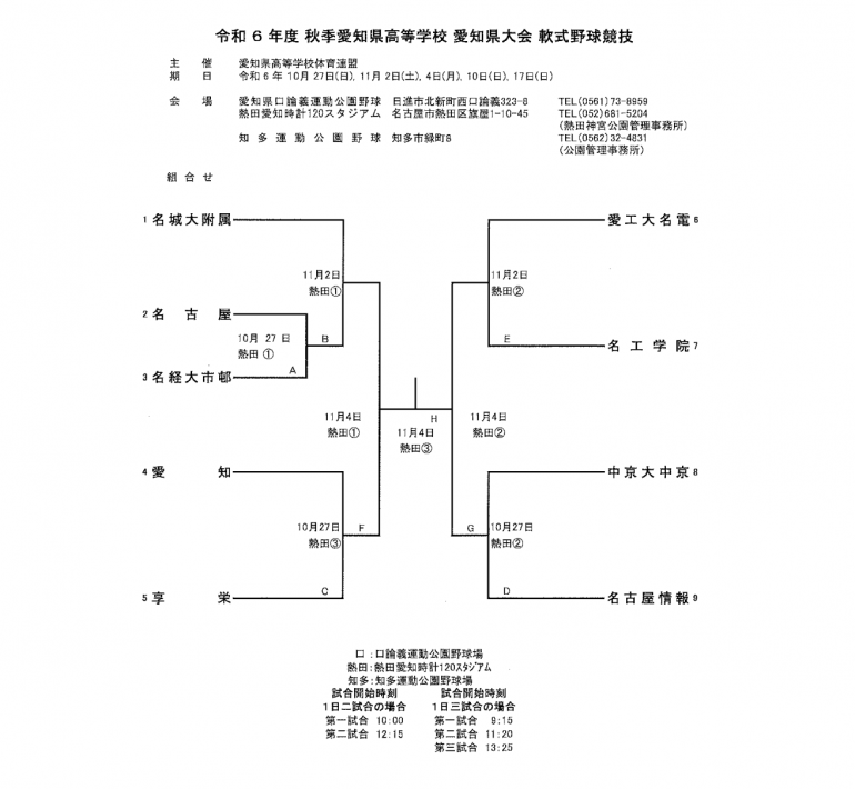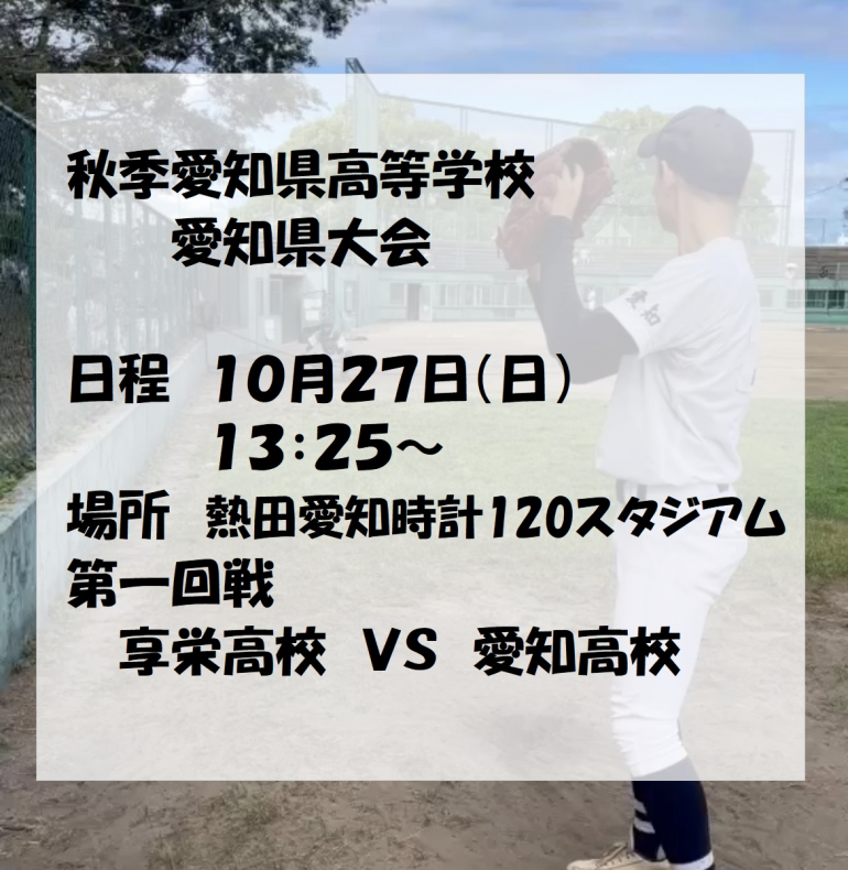 2024年11月09日(土) 部活動 学校ニュース 軟式野球部 名古屋尾張地区大会1回戦の結果について 11月9日(土)に知多市営球場で行われた名古屋尾張地区大会の結果です。 享栄高校VS愛知高校は、7-4で勝利しました。 明日は、準決勝が愛知県口論議運動公園で10時から行われます。 ※本大会は時間で区切っている為、9イニングできない可能性があります。
